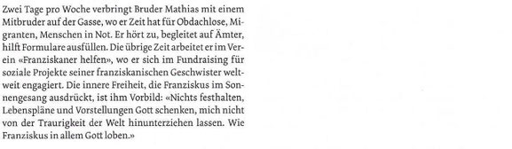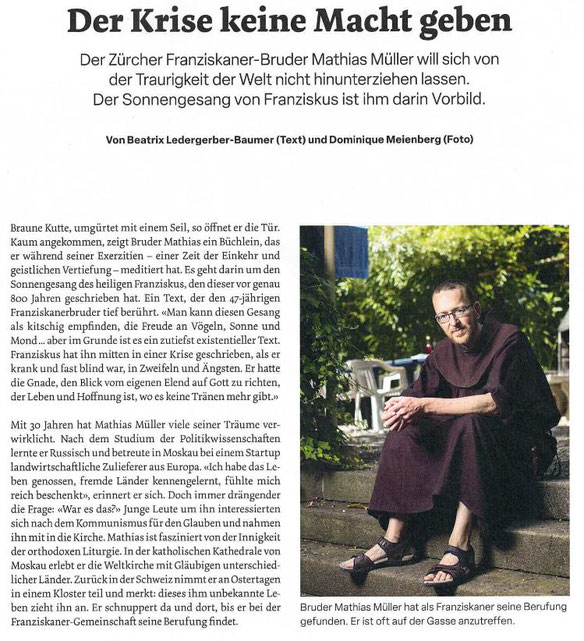 Der Zürcher Franziskaner-Bruder Mathias Müller will sich von der Taurigkeit der Welt nicht hinunterziehen lassen. Der Sonnengesang von Franziskus ist ihm darin Vorbild. In dieser Hymne lädt der heilige Franziskus ein, den Schöpfer, der alles gut und schön erschaffen hat, zu loben und zu preisen. Dieses Lied hat Franziskus in Altitalienisch geschrieben und ist deshalb das wichtigste Zeugnis für die Volkssprache des 13.Jahrhunderts.